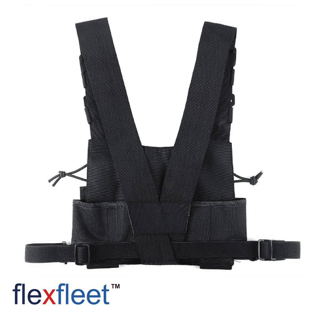 チェストハーネスタイプですので、デューティーベルト等既に腰回りに装備品のスペースが無い場合や、無線機の画面を確認する頻度が高いオペレーションに最適です。 また車両の乗り降りが多い場合など、腰に付けた無線機により車両や周囲を傷をつける心配も低減します。